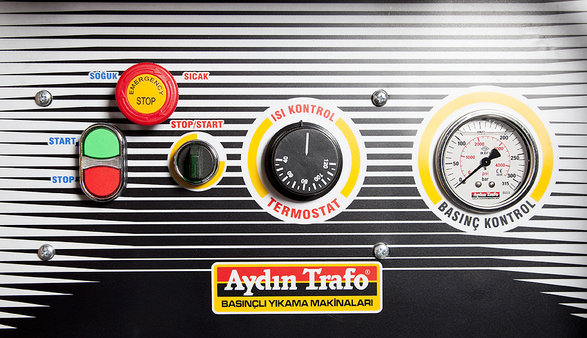 AYDIN TRAFO Yüksek Basınçlı Yıkama Makinalarında 3 silindirli seramik pistonlu INTERPUMP marka pompalar kullanılmaktadır.Bu pompalara by-pass sistemli regülatörler kullanılarak maksimum performans ve gerekli emniyet sağlanmıştır.Sıcak soğuk özellikli yıkama makinalarında dizel yakıt harici resistanslı ürünlerimizle çeşitliliğimiz mevcuttur.
